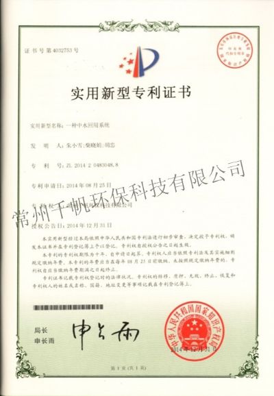實用新型專利證書 一種平板膜組件震蕩清洗系統